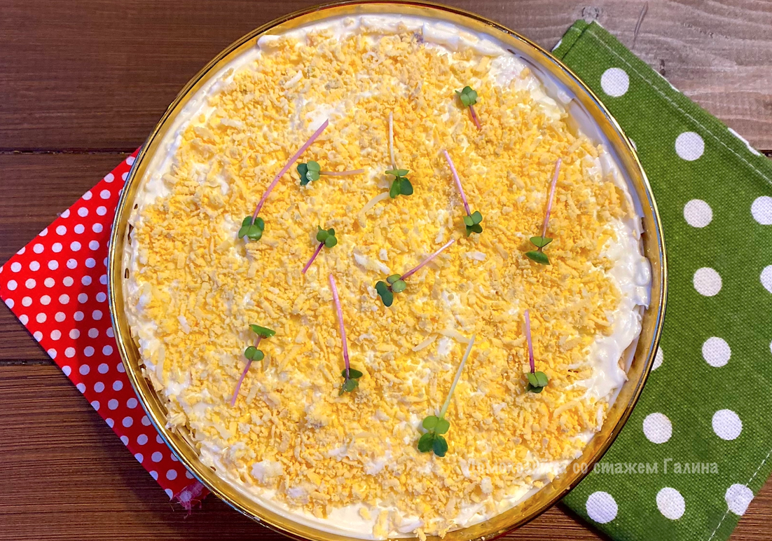 - Следующим слоем идут белки, смазанные майонезом, а сверху посыпаем тертым желтком и украшаем зеленью.