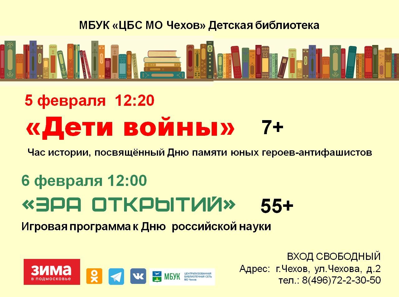 Познакомим с биографиями знаменитых людей нашего Чеховского округа. Узнаем о значимых событиях в их жизни и о многом другом.Будет интересно Возраст: 6+06.02.2026 15:30 ДК «Фортуна» г.о. Чехов, с. Талалихино, ул. Спортивная, д.20Вход...