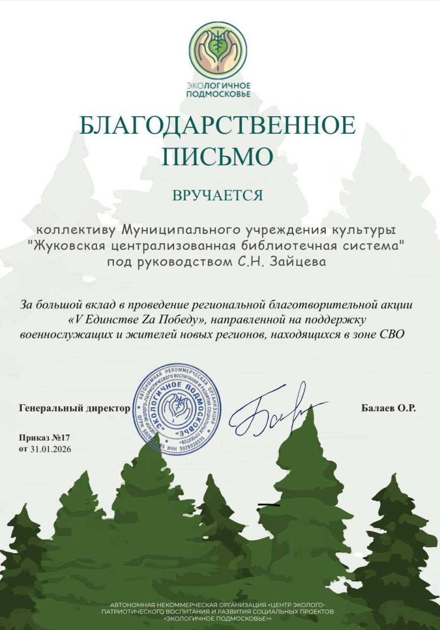 Коллектив Жуковской централизованной библиотечной системы» удостоен Благодарственного письма за активное участие и значительный вклад в проведение региональной благотворительной акции по сбору макулатуры «V Единство Zа Победу». Акция была организована с целью поддержки военнослужащих, а также жителей новых регионов, находящихся в зоне специальной военной операции.