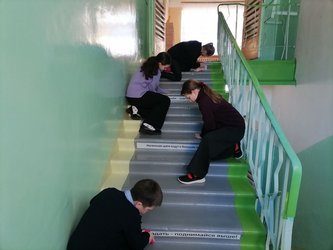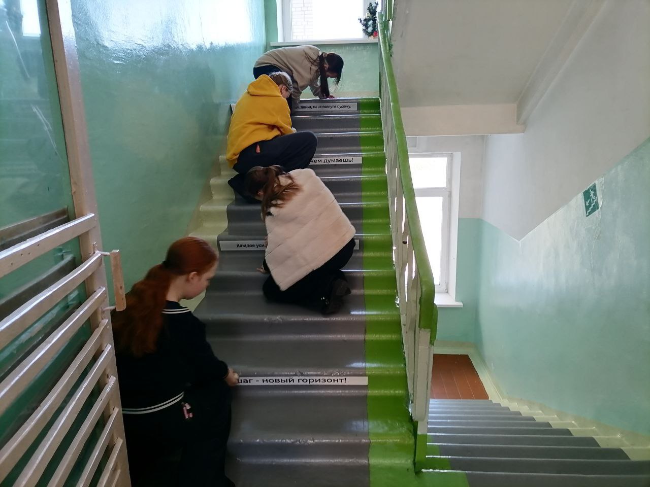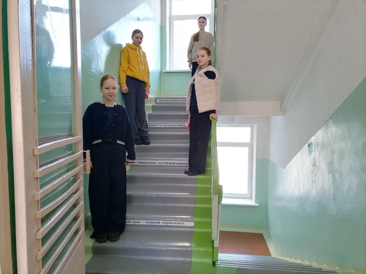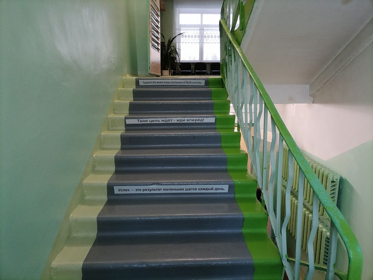 Теперь, поднимаясь по лестнице, ученики начальной школы встречают на ступеньках слова поддержки: Каждый шаг это прогресс!, Твоя вершина ждет тебя!, Поднимаясь, становишься сильнее!, Преодолевай себя на каждой ступени!, Верь в себя шагай смелее!. Яркие цвета и креативное оформление привлекают внимание и создают хорошее настроение.