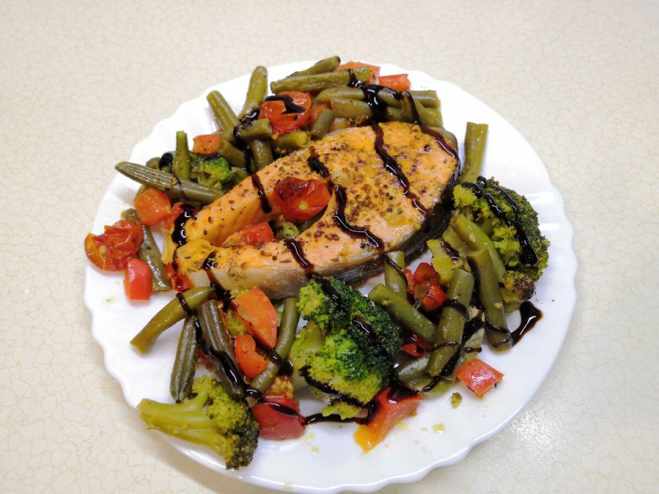 Нет необходимости подбирать точные пропорции или специальные продукты. Под рукой часто оказываются сочные кусочки форели и овощи, которые легко нашлись в холодильнике: стручковая фасоль, брокколи, яркий болгарский перец, несколько черри — их сочетание создаёт и вкус, и настроение.
