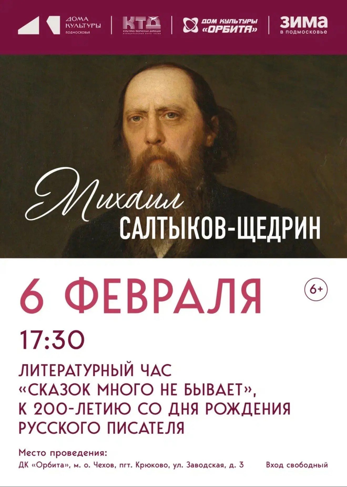 В честь 200-летия М.Е. Салтыкова-Щедрина состоится литературный час «Сказок много не бывает», где участники погрузятся в мир сатирической прозы и остроумных рассказов мастера слова.