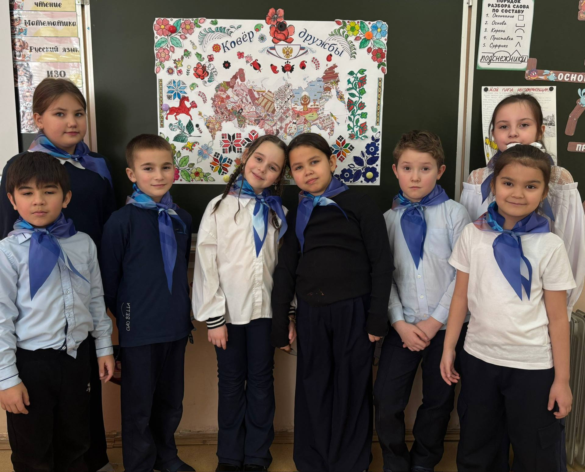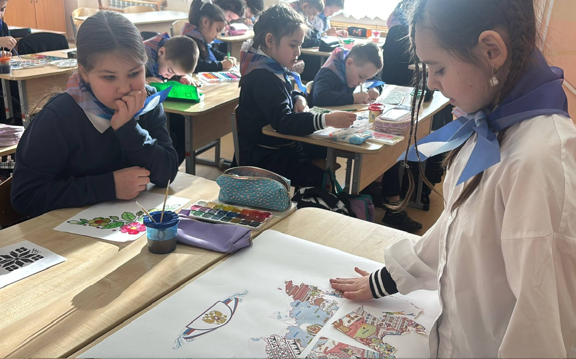Каждый ученик нарисовал символ, узор или красками изобразил частичку культуры одного из народов России. А потом все эти уникальные рисунки собрались в один яркий, многонациональный ковёр — символ нашего взаимного уважения и общих ценностей.