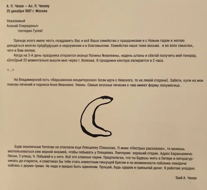 «Забеги, купи на мои пнензы (...) и поднеси Анне Ивановне (Анна Ивановна Хрущева-Сокольникова, гражданская супруга Александра с 1881 по 1888 гг., - Прим. ред.) Уважь», — написал Чехов и проиллюстрировал желаемое.Внимание на первую картинку — речь об изображении снизу.