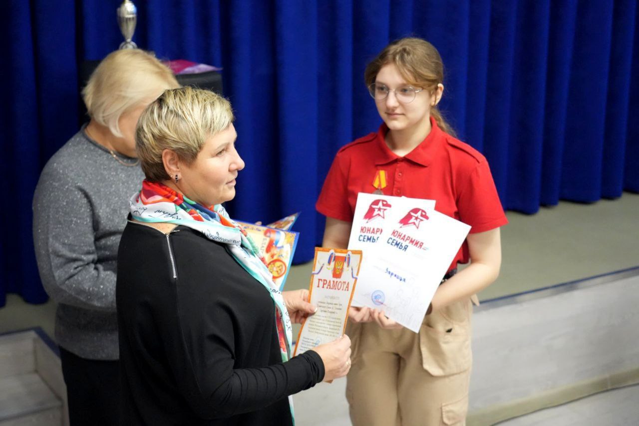 На торжественной линейке в гимназии №5 поздравила юнармейский отряд «Зарница» имени героя Советского Союза А. Г. Гаганова с победой в соревнованиях «Юнармейская семья».