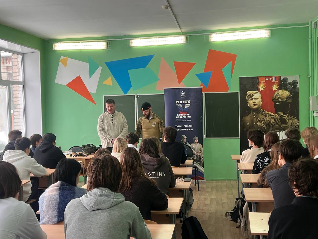 Старшеклассники активно участвовали в диалоге, задавая вопросы о современном вооружении, быте в зоне проведения специальной военной операции и о том, как стать достойным защитником своей страны.