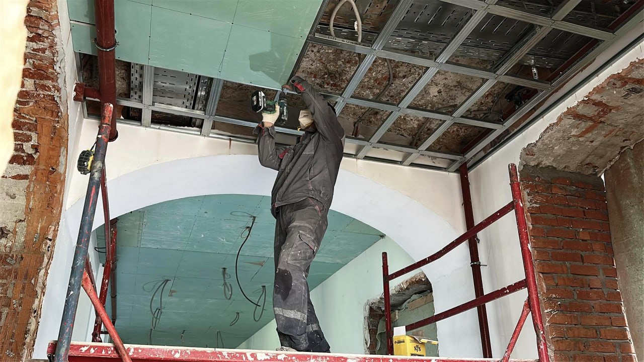 Как рассказал начальник участка подрядной компании Денис Голубев, на объекте ежедневно работают около 20 специалистов. Основные усилия сосредоточены внутри здания — техника на данном этапе не требуется. Неделю назад здесь запустили отопление, что позволило перейти к полноценным отделочным работам и стабилизировать температурный режим.