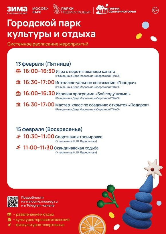 Пятница, 13 февраля | 16:00 - Народные забавы у Резиденции Деда Мороза (перетягивание каната, «Городки», бои подушками) и создание открыток
