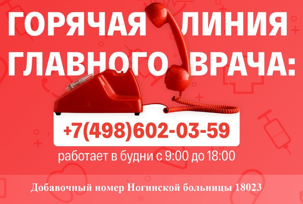 Единый телефон «горячей линии» — 8(498)602-03-59 — позвонить можно с 9:00 до 18:00 в рабочие дни. Добавочный номер Ногинской больницы 18023.