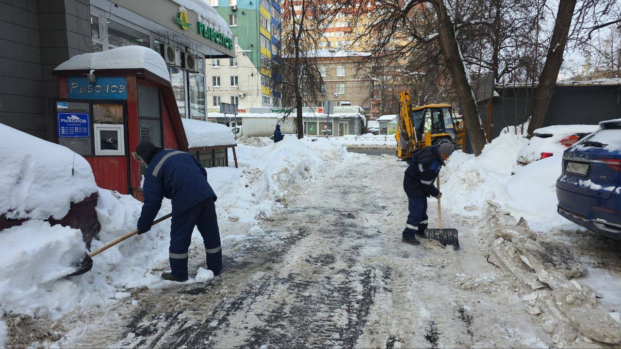 Работы по уборке снега идут во дворах, на автомобильных дорогах и пешеходных маршрутах. Проблемные участки обрабатывают специальными материалами, чтобы снизить вероятность образования наледи.