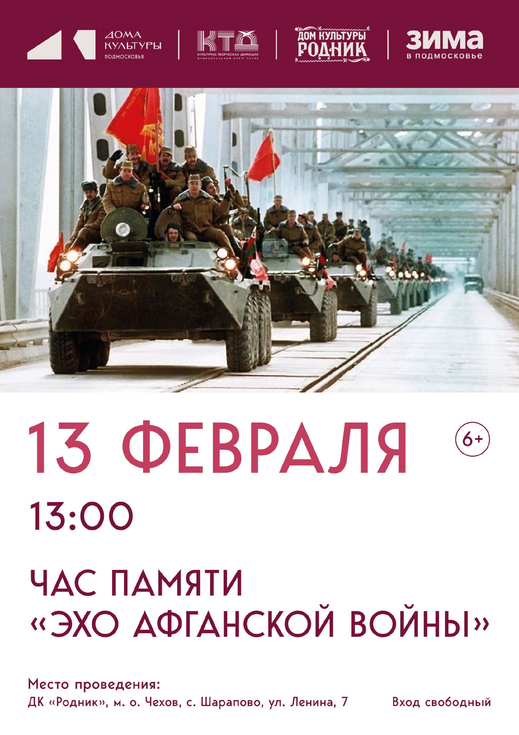 В ДК "Родник" пройдет час памяти на котором поговорим о мужестве, стойкости и героизме советских солдат, принимавших участие в военных событиях в Афганистане.