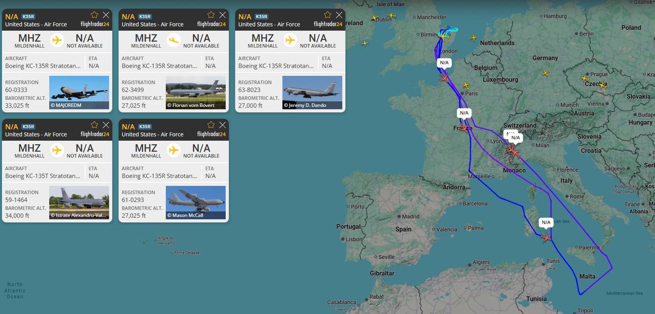 По меньшей мере пять самолётов-заправщиков KC-135R/T вылетели с авиабазы Королевских ВВС Милденхолл в направлении юга Европы, обеспечивая воздушную поддержку группе из шести истребителей F-35A Lightning из эскадрильи The...