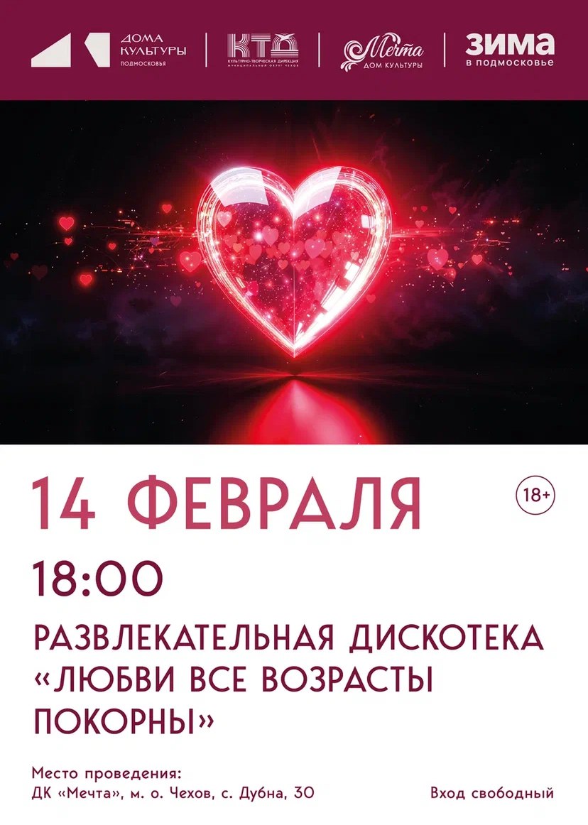 Приглашаем тебя на яркую и зажигательную дискотеку в ДК «Мечта» м.о. Чехов в честь Дня всех влюблённых!