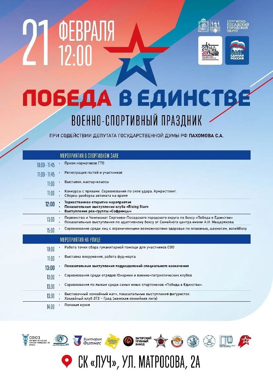 В программе: приём нормативов ГТО по плаванию для участников от 6 лет, торжественное открытие с показательными номерами клуба Rising Star и литией в память о погибших в специальной военной операции, первенство и чемпионат по боксу «Победа в единстве», выступление рок-группы «Софринцы», соревнования по плаванию, шашкам и шахматам среди лиц с ограниченными возможностями здоровья и инвалидов, а также будут представлены выставки, мастер-классы и конкурсы с призами, включая армрестлинг и сборку-разборку автомата на время. Дополнительно будет работать выставочная зона ГТО с наградами за лучшие достижения. На открытой площадке организуют выставку вооружения и показательные выступления спецподразделений, пройдут эстафеты для отрядов Юнармии и военно-патриотических клубов, лыжные соревнования среди юных спортсменов, а также состоится выставочный хоккейный матч и показательные номера фигуристок. На территории будет работать полевая кухня и фудкорт.