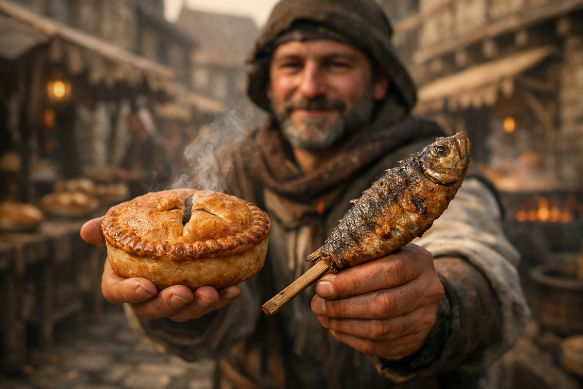 Середина XIII века, Лондон. На пристани ранним утром портовый рабочий передаёт монету владельцу ларька с угощениями и получает горячий мясной пирог, завернутый в ткань. Дым от очага смешивается с утренним туманом, а невероятный запах жареного мяса распространяется по узким улочкам. У него нет времени на завтрак дома, и он отправляется по своим делам с едой на ходу.