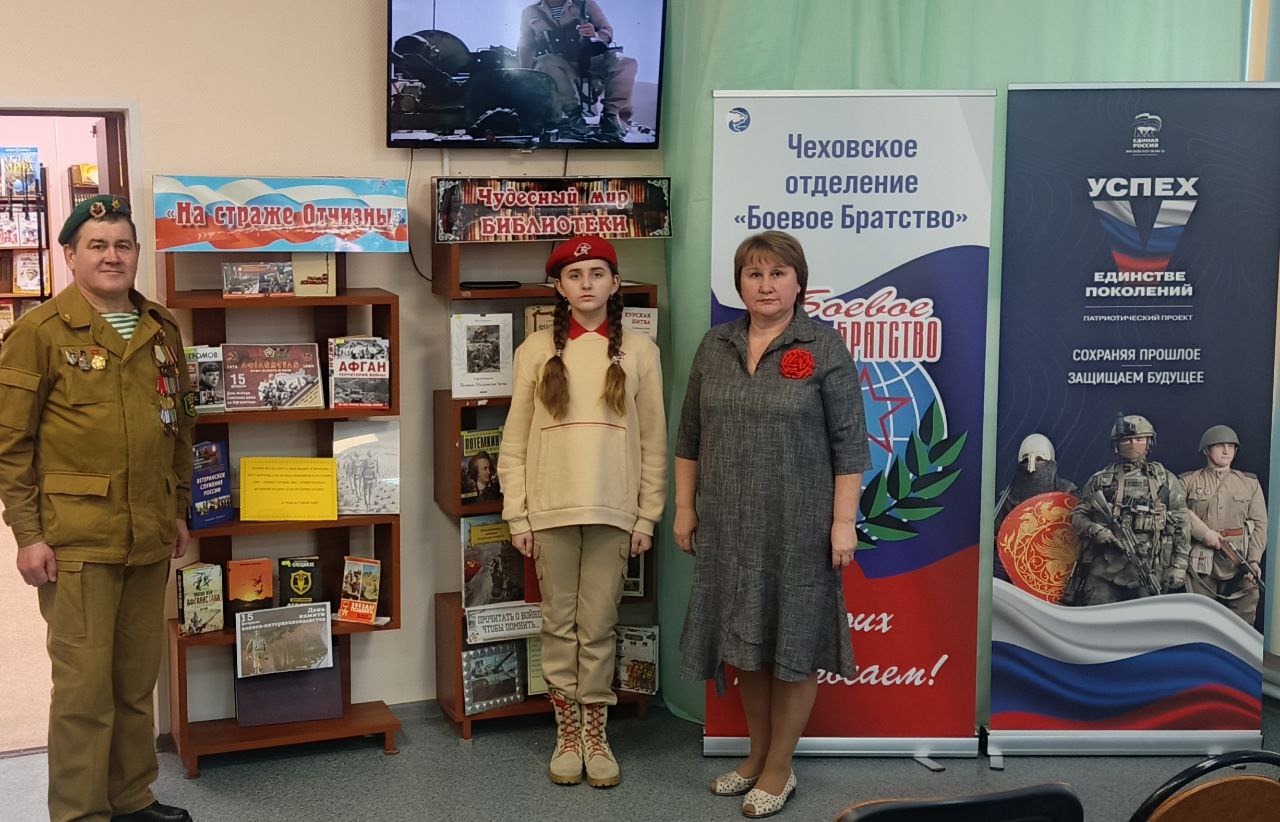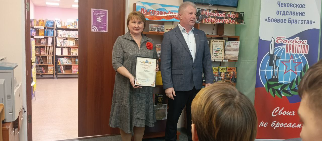 Благодарственное письмо от Всероссийской общественной организации ветеранов «БОЕВОЕ БРАТСТВО» Нестеровой Галине Александровне-заведующей Манушкинской сельской библиотекой, за военно-патриотическое воспитание молодёжи Московской области.