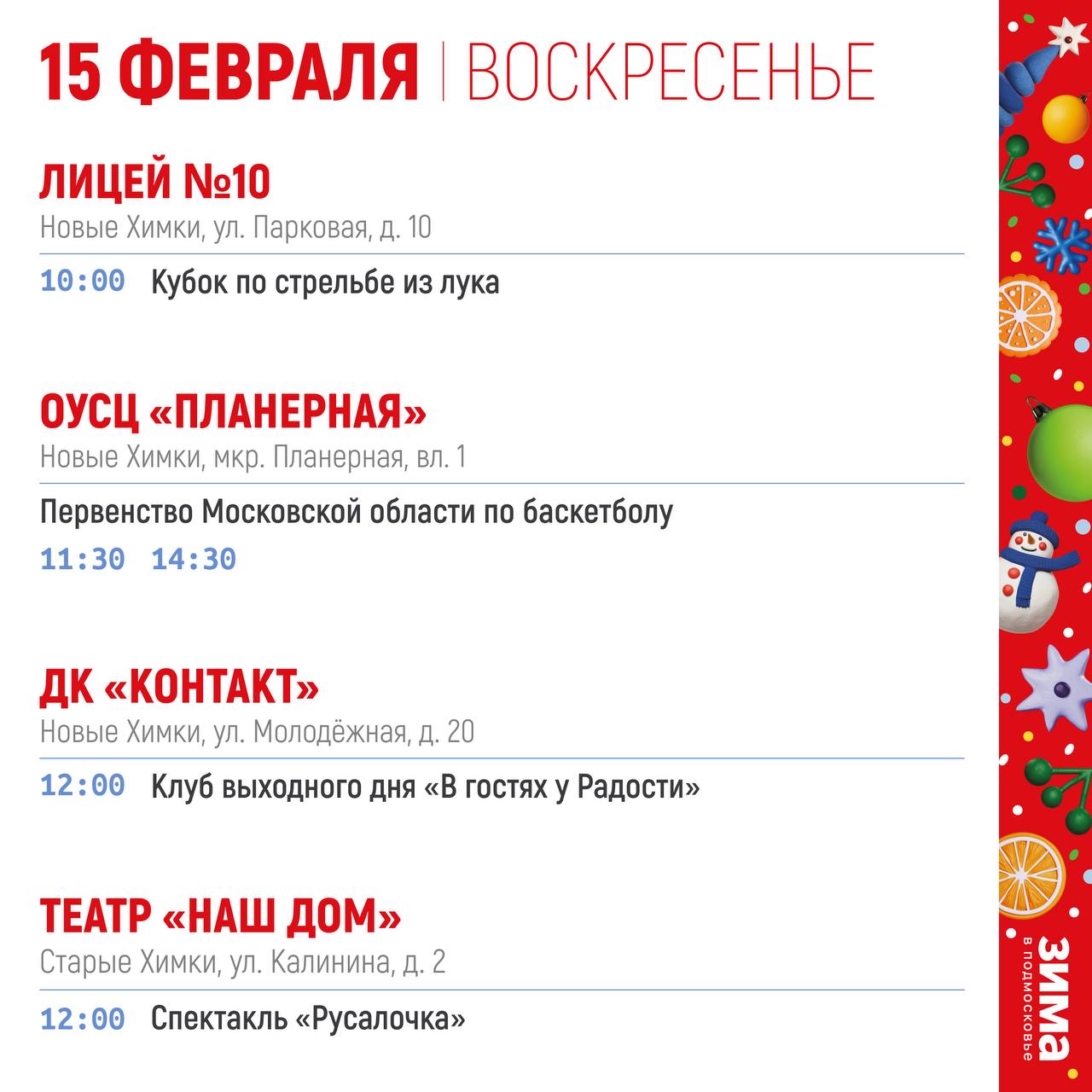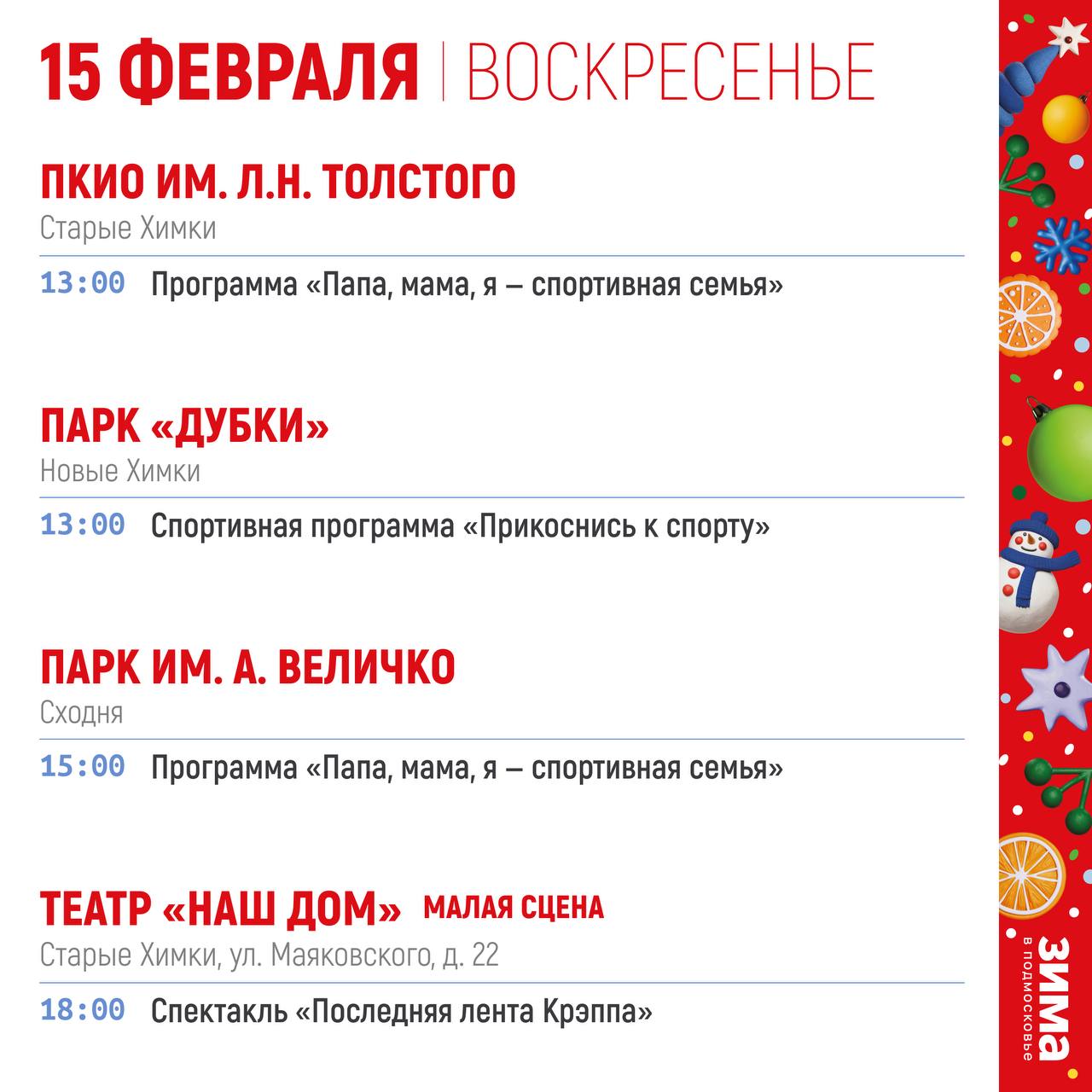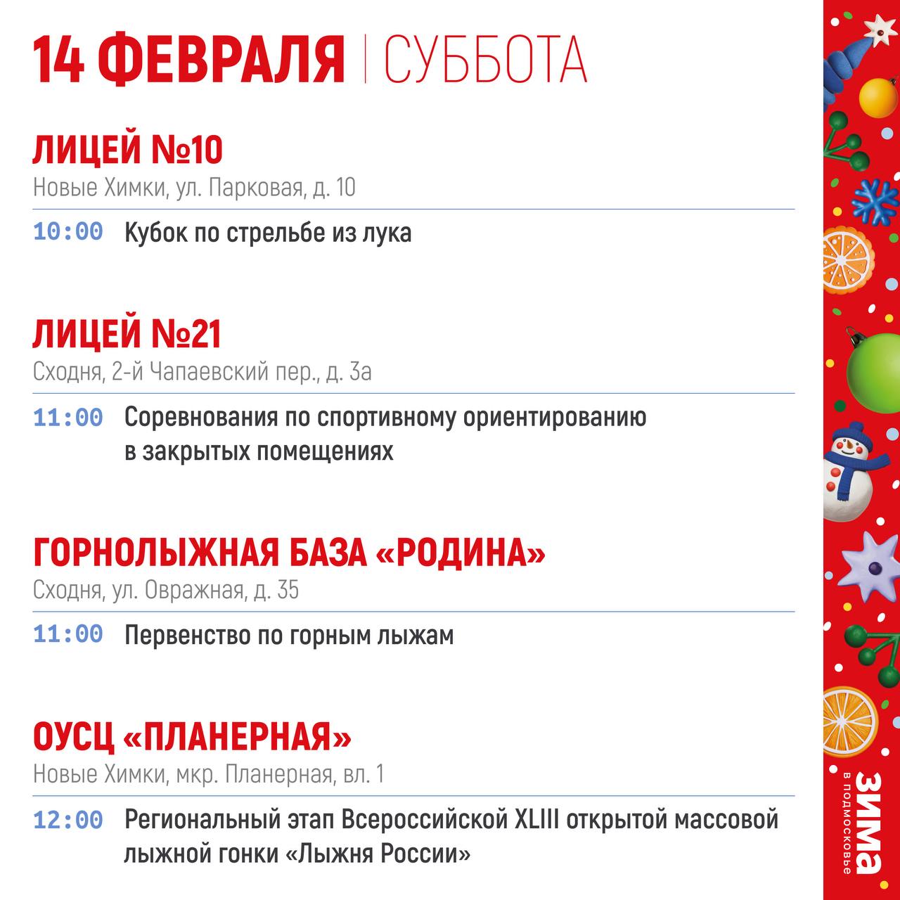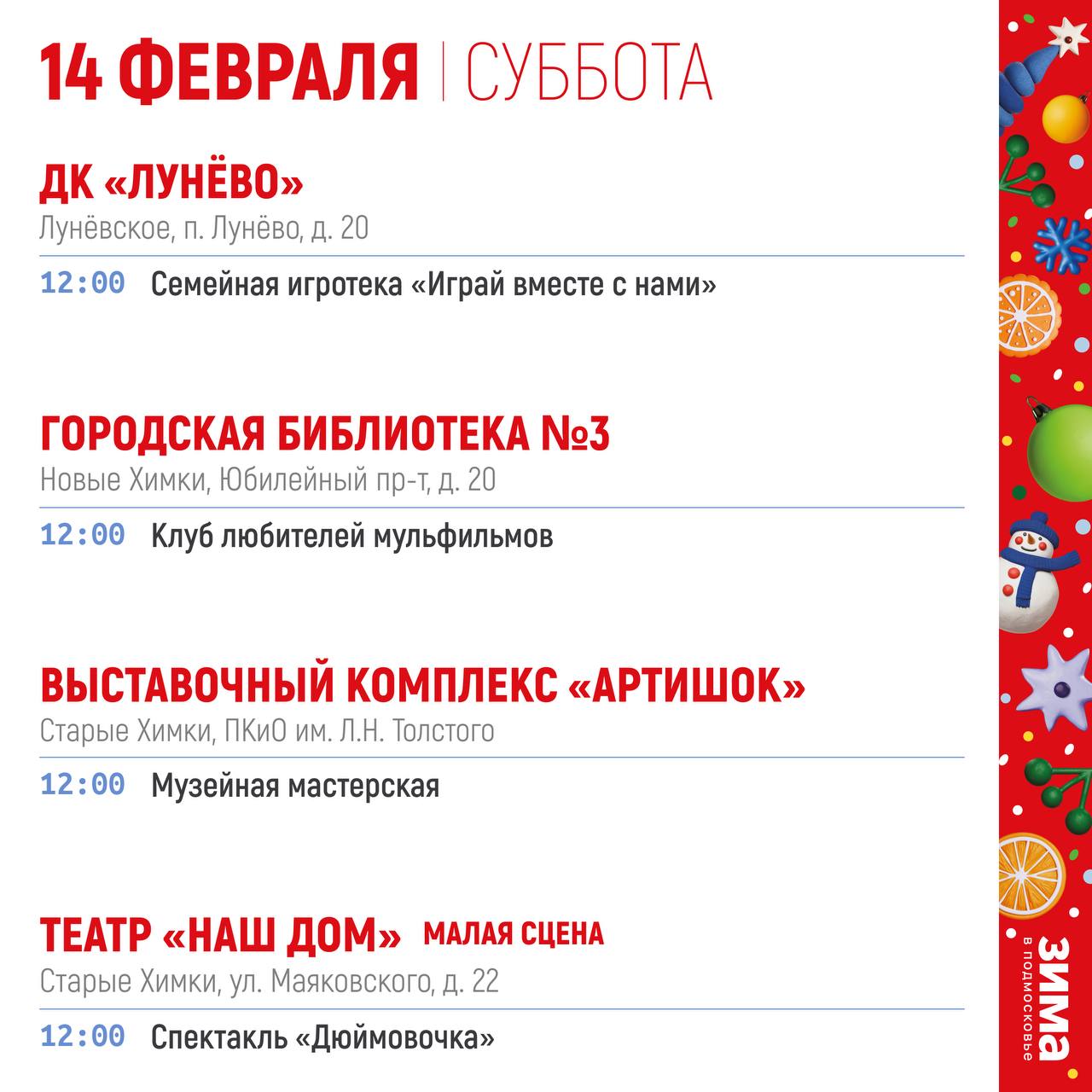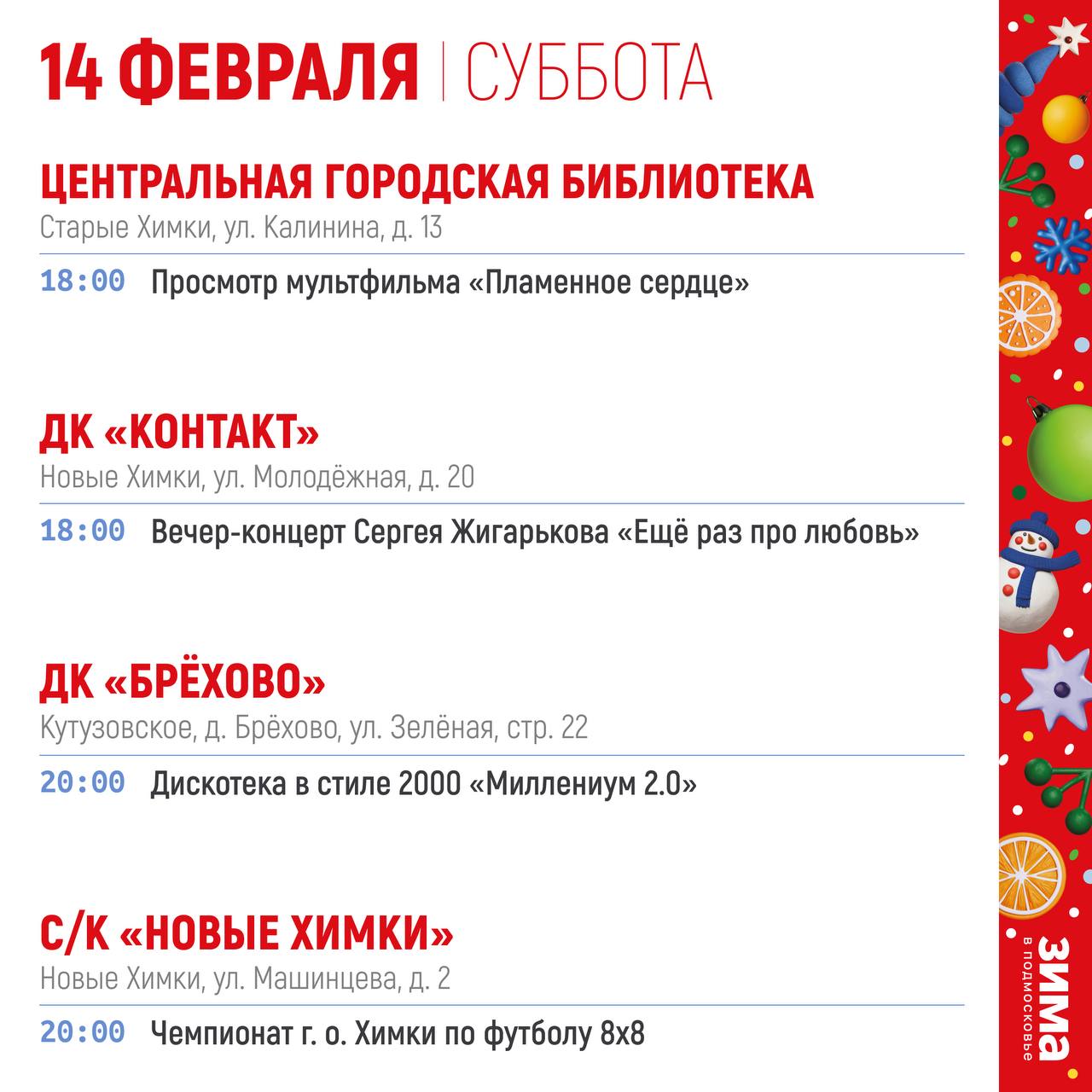 СУББОТА (14 февраля )Зарядка от «Здорового Отечества» (Михаил Авдалян)11:00 Городской парк культуры и отдыха г. ЧеховИгровая программа для детей (0+)12:00 - 12:40 Городской парк культуры и отдыха г. ЧеховВикторина "Всезнайки" (6+)12:40 - 13:00...