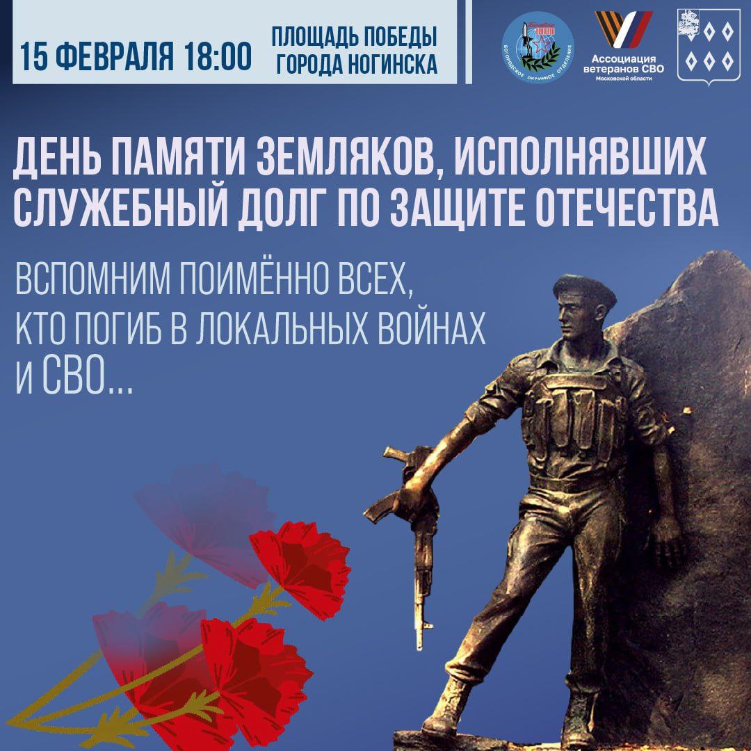 Сегодня. 15 февраля, в 18:00 в День памяти воинов-интернационалистов на площади Победы в Ногинске состоится митинг. Затем колонна участников пройдет шествием к мемориалу у 21-й школы.