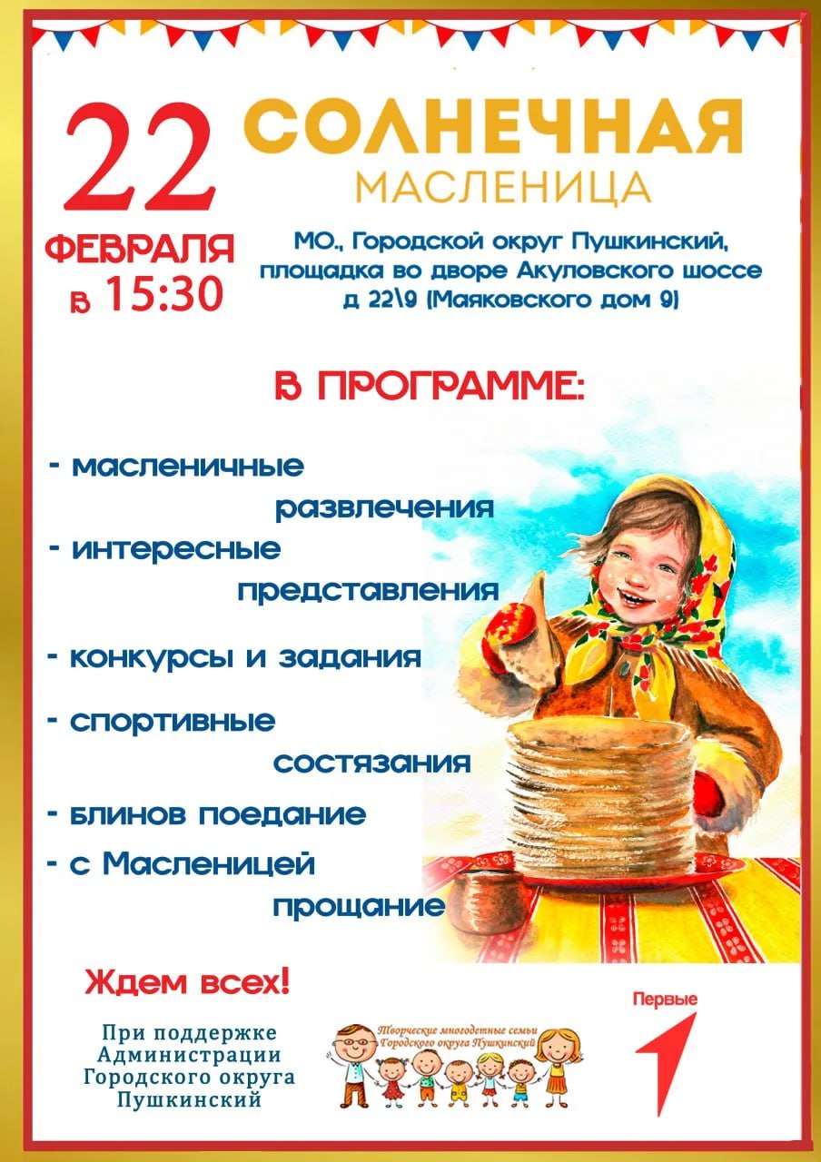 Приглашаем вас на праздничные масленичные гуляния, которые пройдут 22 февраля во дворе по адресу: г. Пушкино, Акуловское ш., 22 (ул. Маяковского, 9). Начало в 15.30.