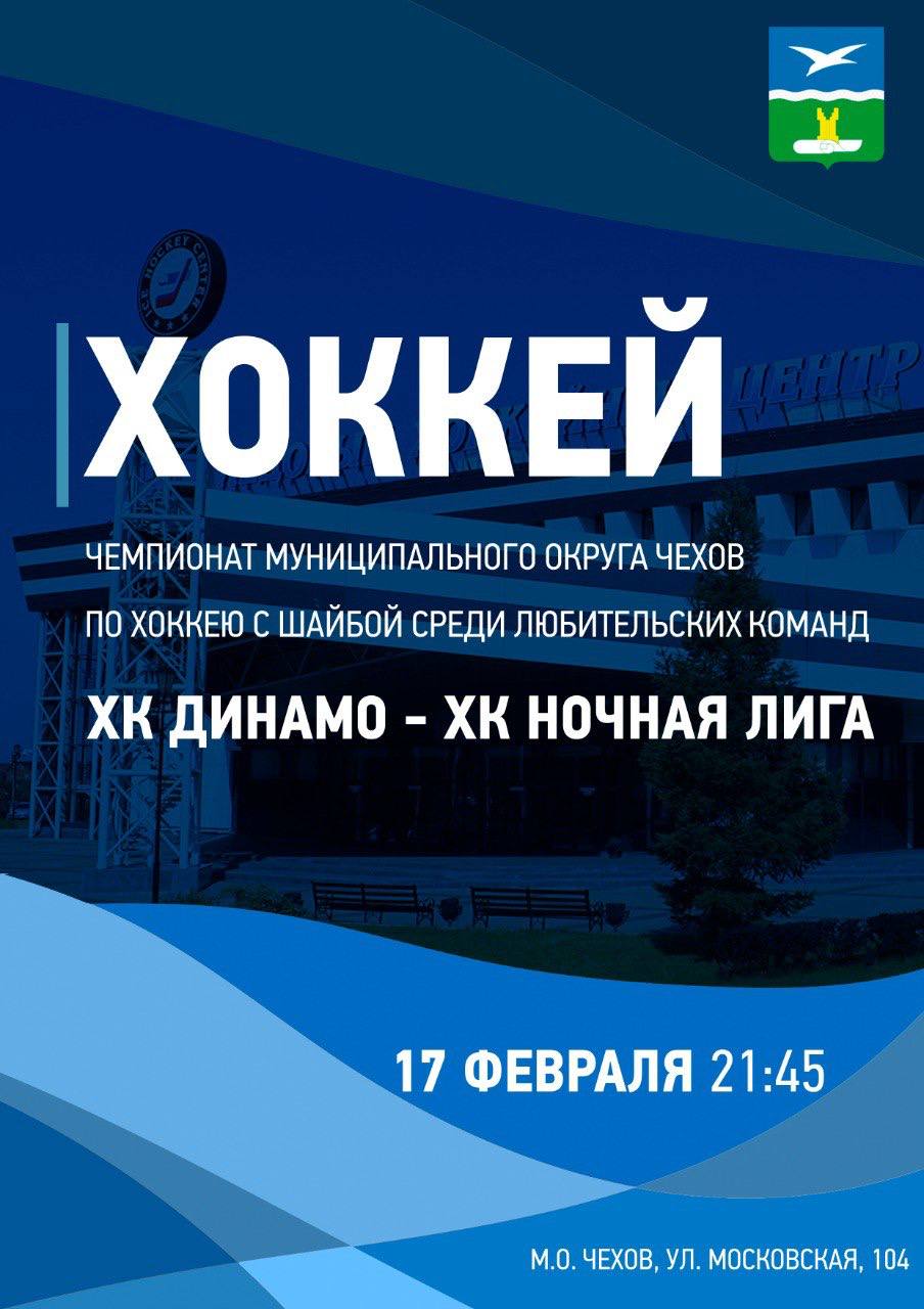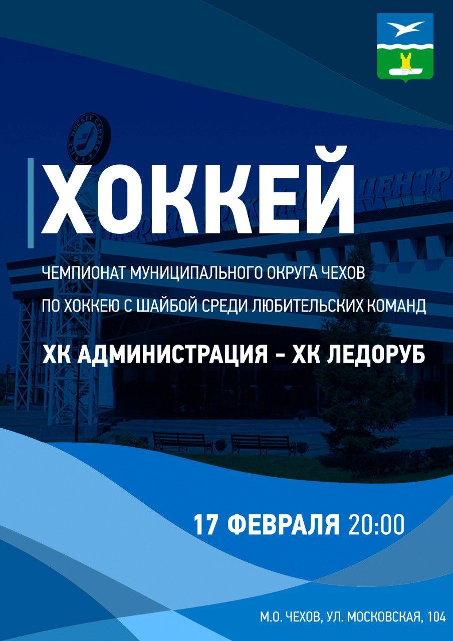 Завтра в Ледовом дворце пройдут игры Чемпионата муниципального округа Чехов по хоккею с шайбой среди любительских команд! На льду, в первой игре встретятся местные команды «Ледоруб» и «Администрация». Во второй - ХК «Динамо» из Подольска и ХК «Ночная Лига» из Серпухова.