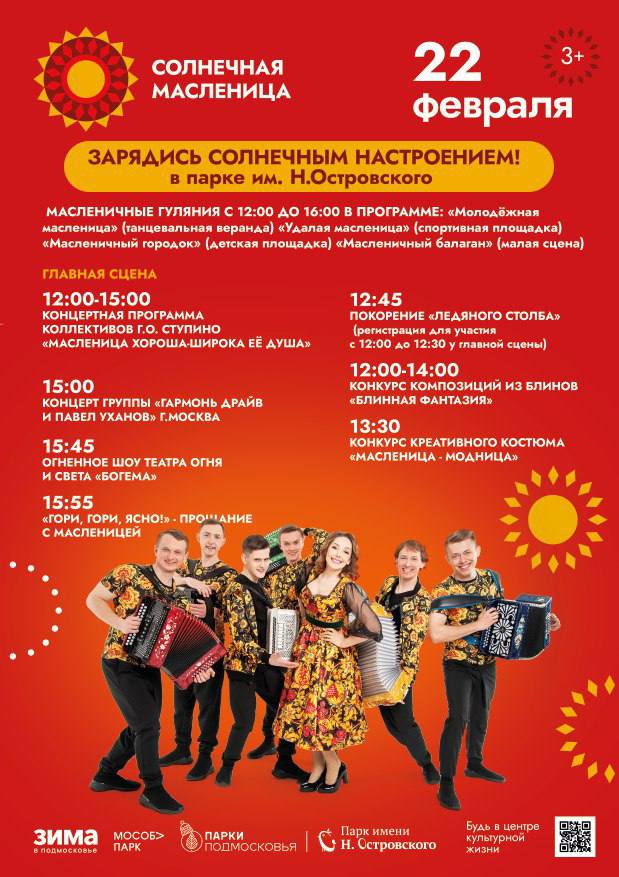 Главной площадкой празднования Масленицы 22 февраля традиционно станет Ступинский парк культуры и отдыха имени Николая Островского. Праздничные активности запланированы с 12.00 до 16.00.