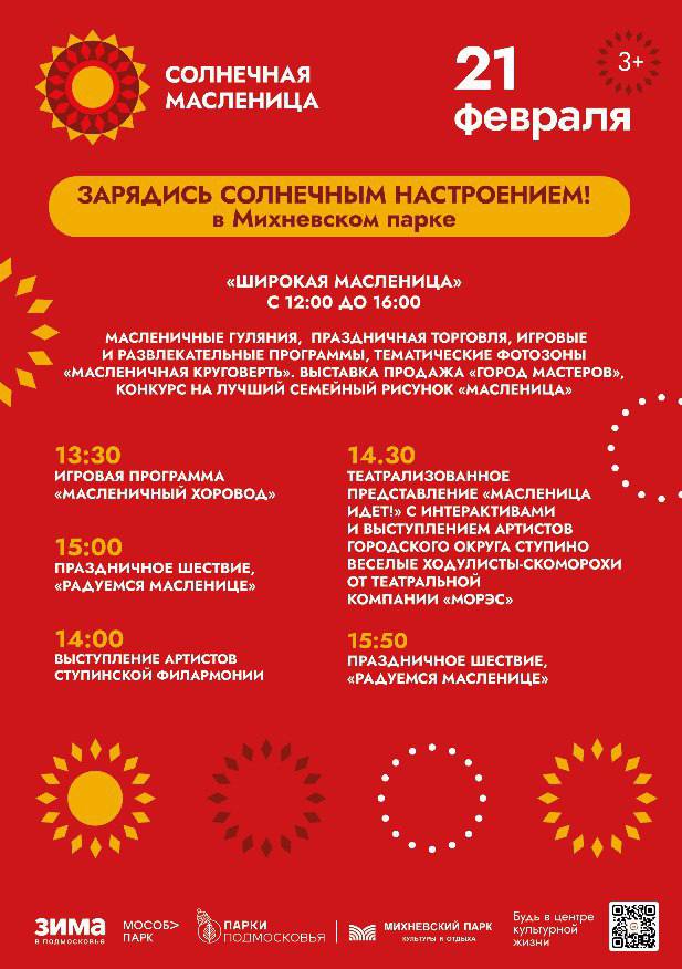 21 февраля, в субботу, праздник «Солнечная Масленица» пройдет в Михневском парке культуры и отдыха. 0+