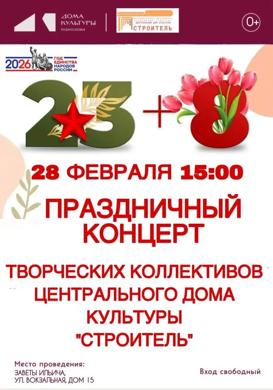 23 февраля праздничные концерты пройдут в ДК «Современник» пос. Лесные Поляны, в ДК «Импульс» пос. Челюскинский, в ДК «Ельдигино», и в ДК «Строитель» в мкр Заветы Ильича