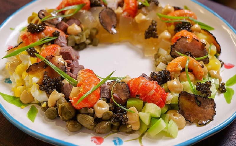 Следующий этап: мясо обжаривается до золотистой корочки на оливковом масле, а овощи — свежие и маринованные огурцы, картофель и язык — нарезаются мелкими кубиками. Также нарезаем трюфели тонкими ломтиками, поливая их трюфельным маслом. Раковые шейки очищаем от панцирей и кишечника.