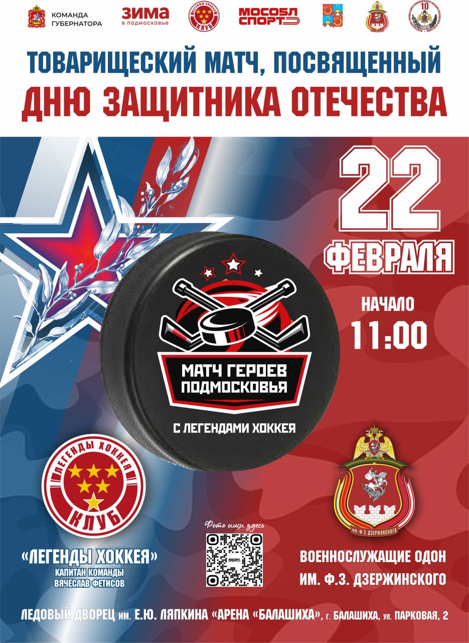 Матч состоится 22 февраля на арене Ледового дворца им. Ю. Ляпкина в Балашихе в преддверииДня защитника Отечества.