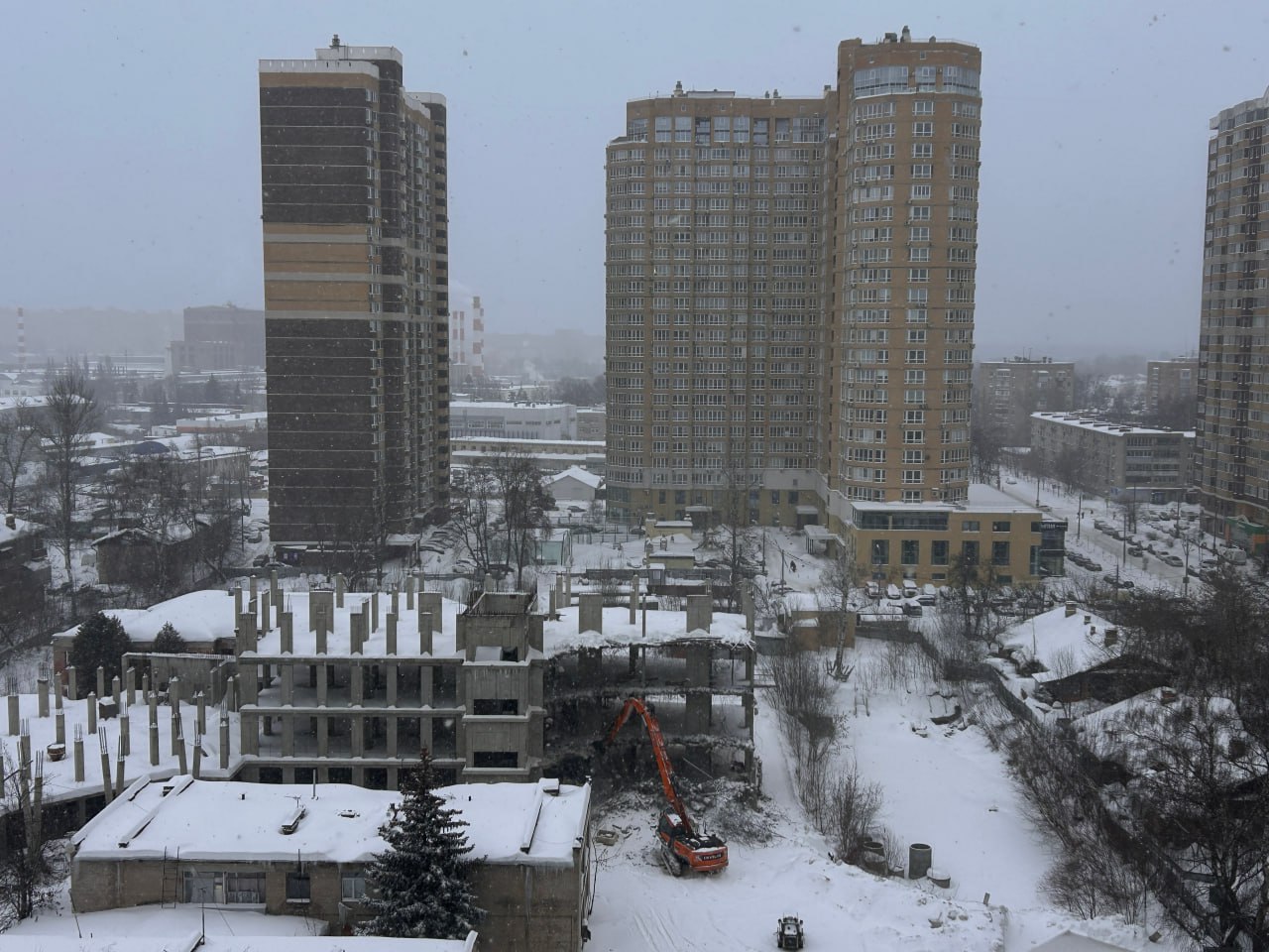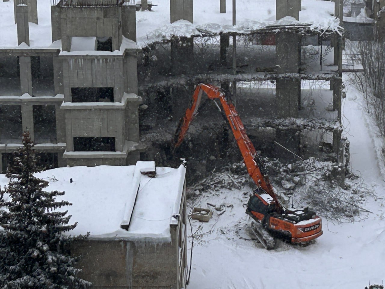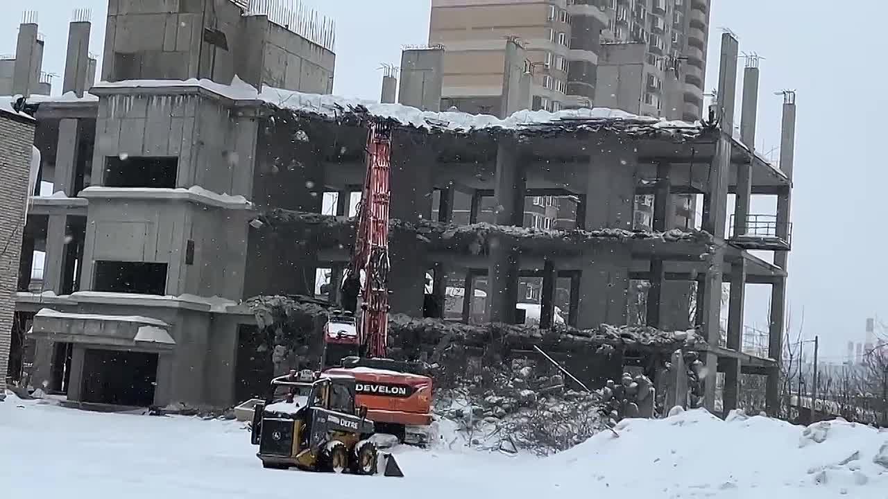 На улице Ленина в жилом комплексе «Золотые ворота» рабочие приступили к сносу недостроенного здания. В данный момент строительная техника ломает бетонные конструкции, которые были признаны непригодными для дальнейшего строительства, они будут полностью демонтированы.