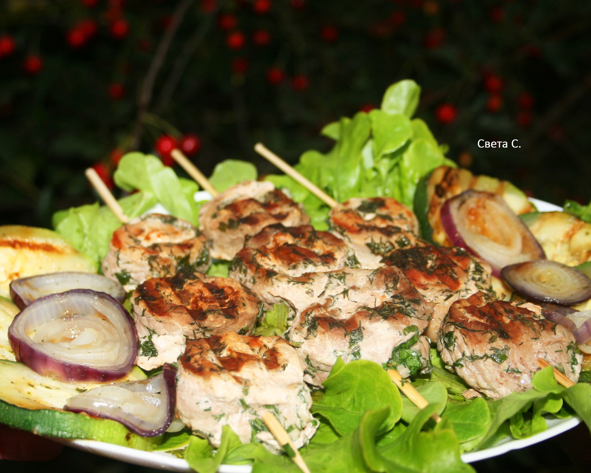Подавайте шашлыки и овощи на листьях салата. Это идеальное сочетание, которое понравится каждому. Приятного аппетита!