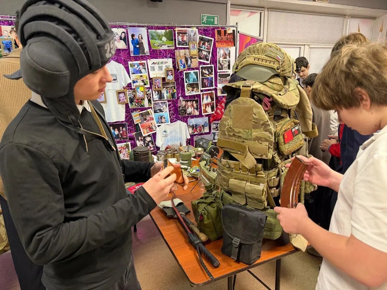 После просмотра ребята познакомились с выставкой подлинных артефактов и трофеев времен Великой Отечественной войны, а также с современными экспонатами с полей спецоперации.