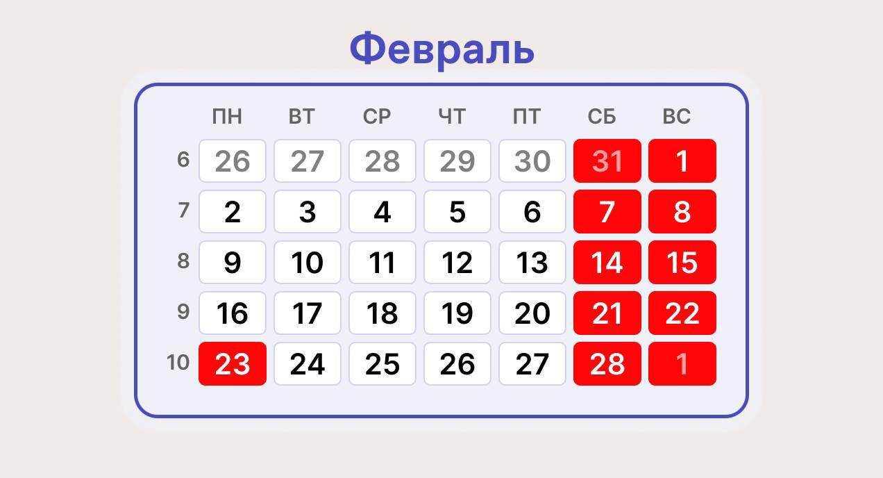 22 и 23 февраля — выходные.