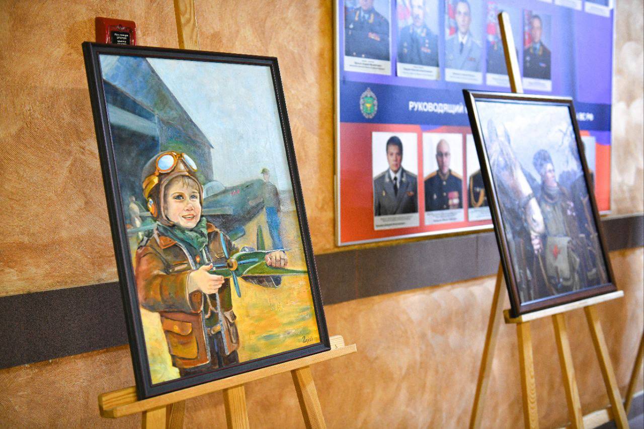 * Главный эмоциональный центр выставки – полотно «Ангелы России». На картине – солдат СВО в минуту прощания с матерью: она обнимает сына, который уходит защищать Родину.