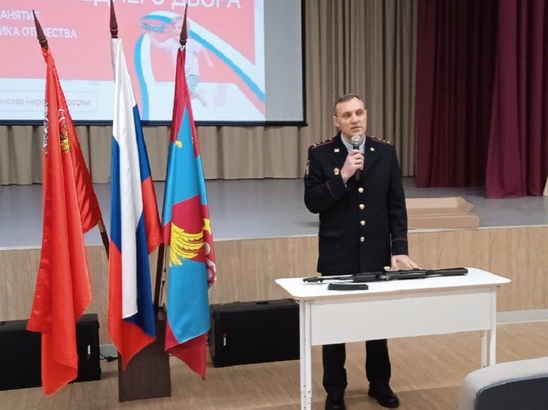 Сотрудники МУ МВД России «Люберецкое» приняли участие в ПМ «Разговоры о важном», посвященном Дню защитника Отечества. Они встретились с учениками городской гимназии.
