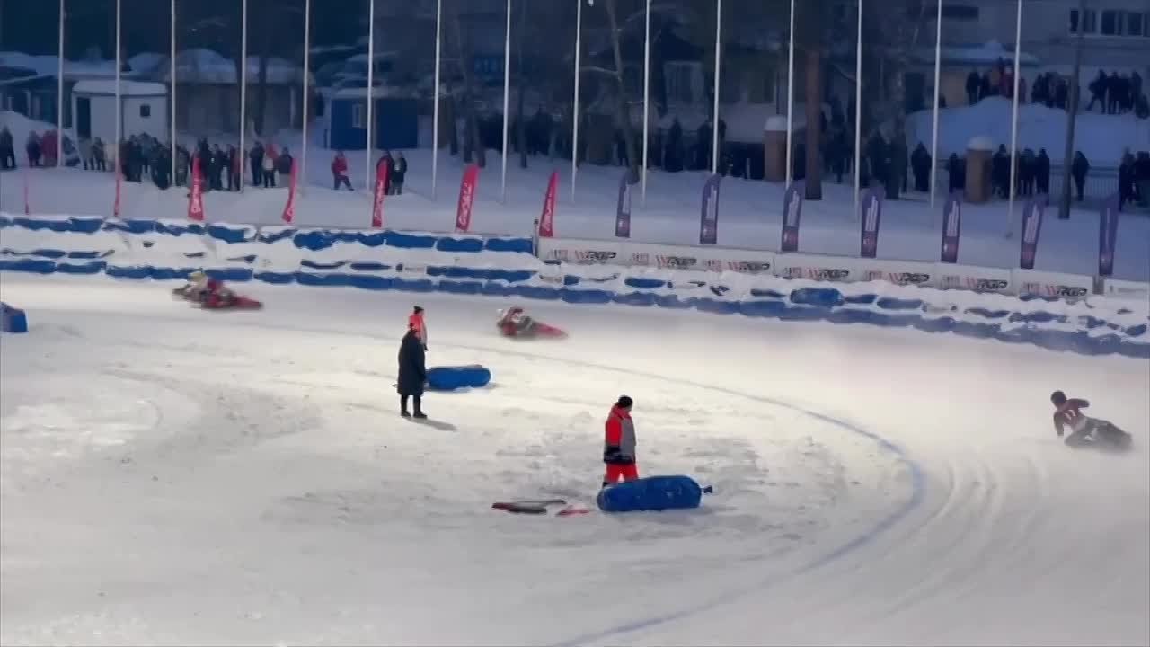 Заезды Суперфинала Личного Чемпионата России по мотогонкам на льду стартовали.