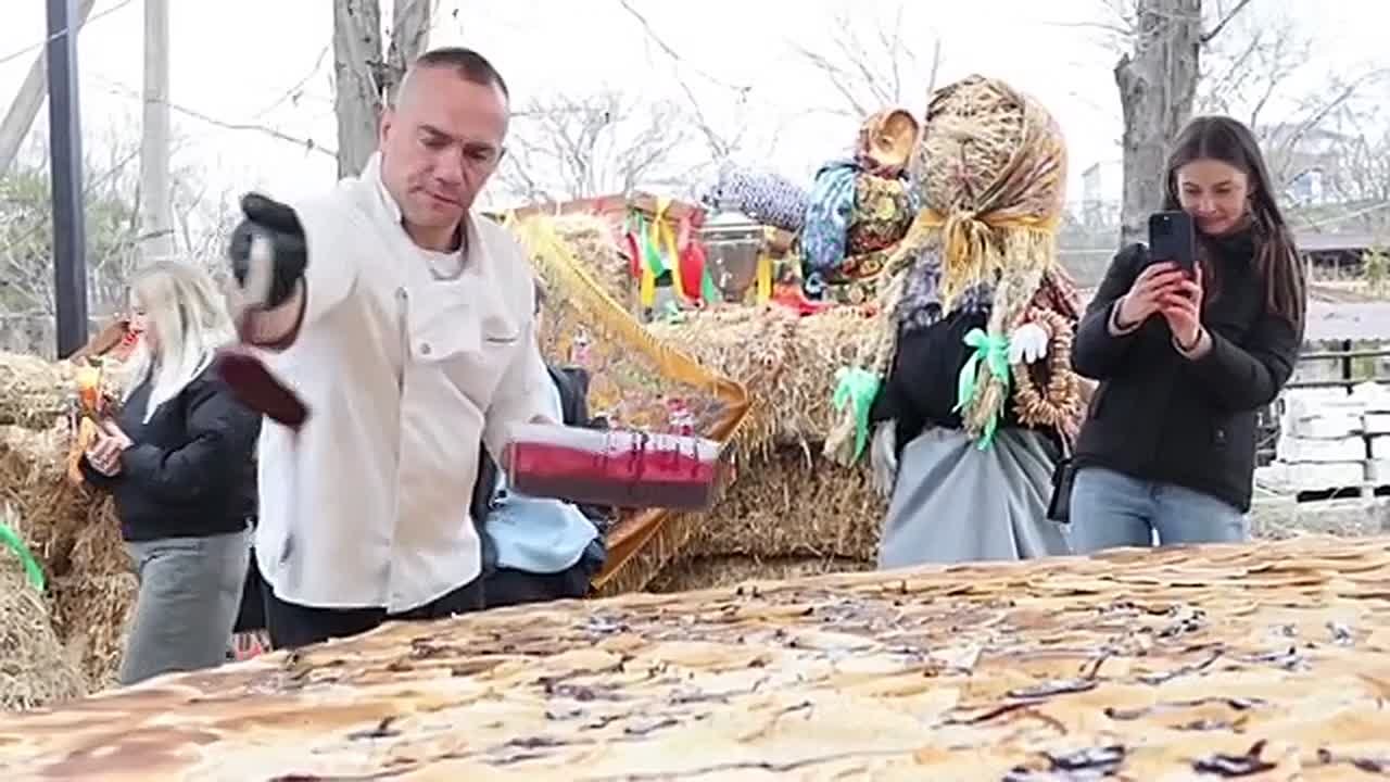 В Крыму испекли царь-блин диаметром 3,5 метра. Для создания рекорда в Бахчисарайском парке миниатюр использовали более 700 обычных блинов.