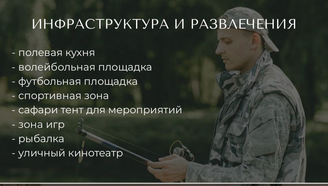 Наслаждайтесь ароматом еды с полевой кухни, общайтесь у костра и мангала, занимайтесь спортом. Питание предоставляется на весь срок проживания.