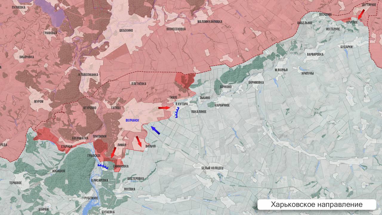 На Харьковском участке продолжаются бои в районе Графского, Симиновки и Волчанских хуторов. Продвижение не превышает нескольких сотен метров в сутки на отдельных участках.