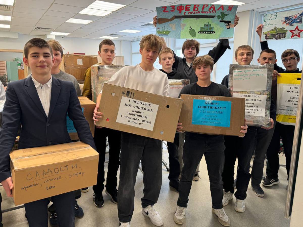 Стоит отметить, что в лицее №5 не ограничиваются только просветительскими мероприятиями — здесь налажена системная поддержка участников спецоперации. Сбор посылок для наших бойцов регулярно организует учитель математики Наталья Кабакова – классный руководитель 9 «В» класса.