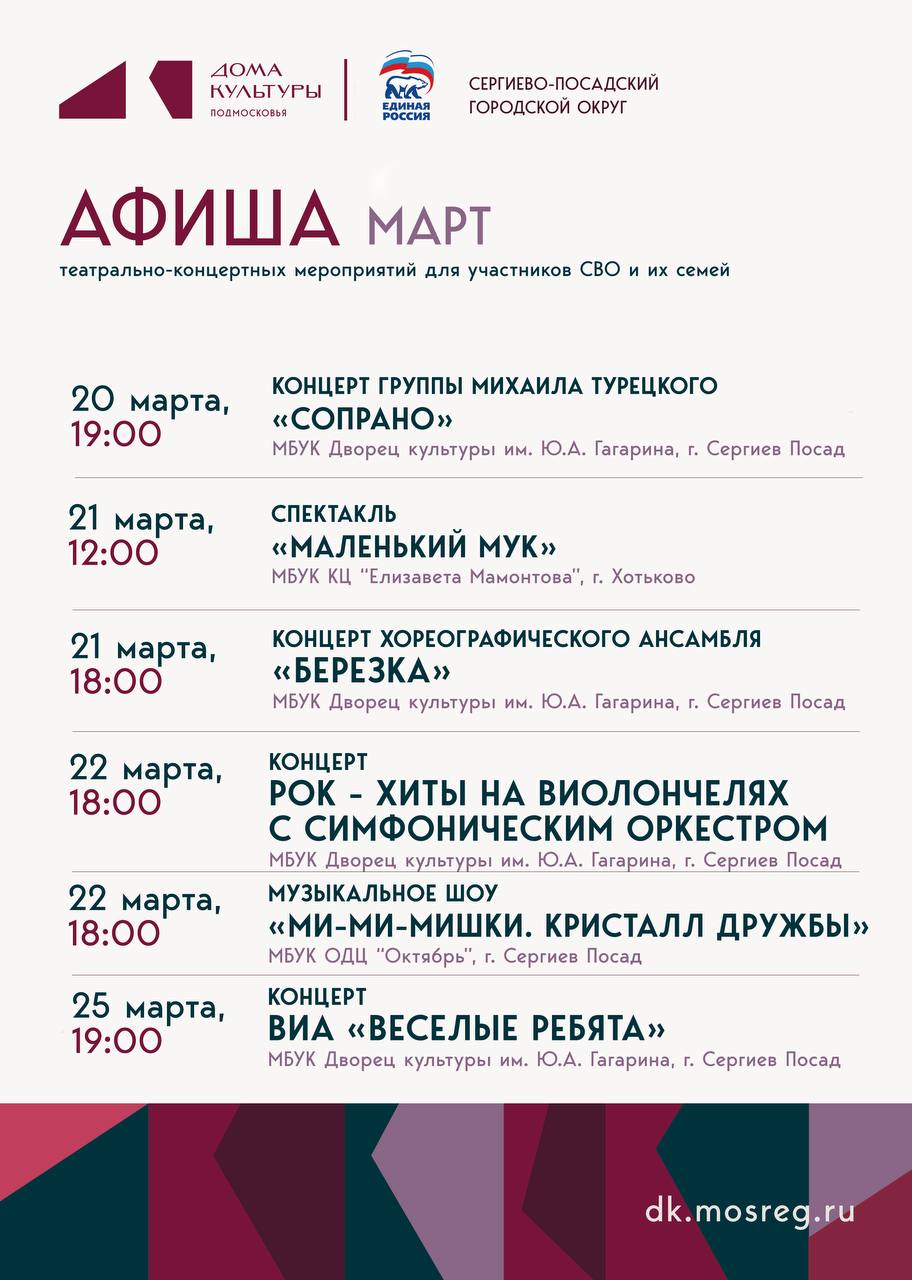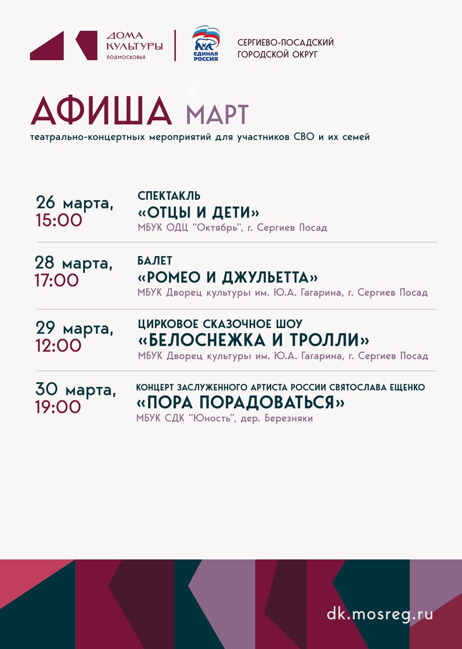 Культурно-досуговые учреждения округа и партия «Единая Россия» приглашают на театрально-концертные мероприятия в марте.
