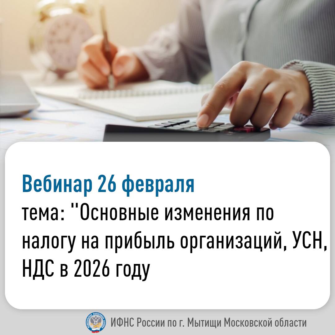 ИФНС России по Московской области приглашает налогоплательщиков 26 февраля в 11.00 принять участие в вебинаре на тему «Основные изменения по налогу на прибыль организаций, УСН, НДС в 2026 году».