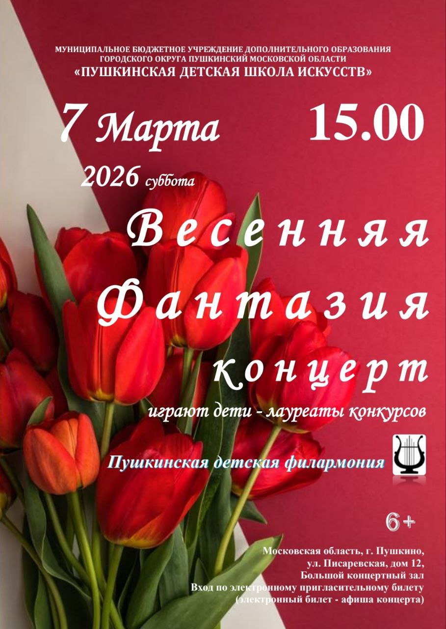 8 Марта — первый весенний праздник, который объединяет в себе всё самое прекрасное: красоту, любовь, доброту и нежность — всё то, что олицетворяет образ Женщины. В преддверии Международного женского дня, 7 марта в 15:00, в стенах Пушкинской детской школы искусств на большой концертной сцене состоится праздничный концерт «Весенняя фантазия»!
