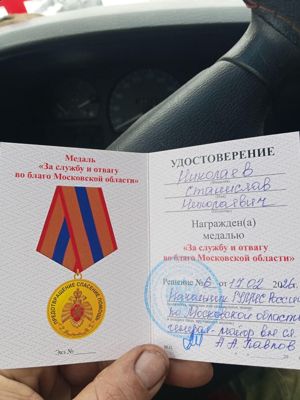 Начальник Главного управления МЧС России по Московской области генерал-майор внутренней службы Алексей Павлов наградил Станислава Николаева за образцовое исполнение служебных обязанностей, профессионализм и высокую ответственность при выполнении поставленных задач медалью «За службу и отвагу во благо Московской области».