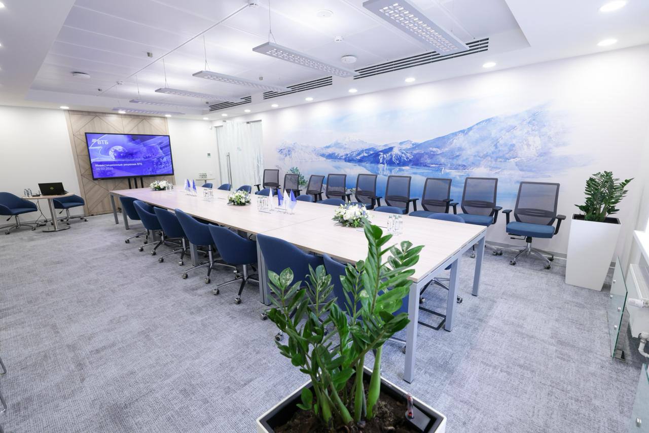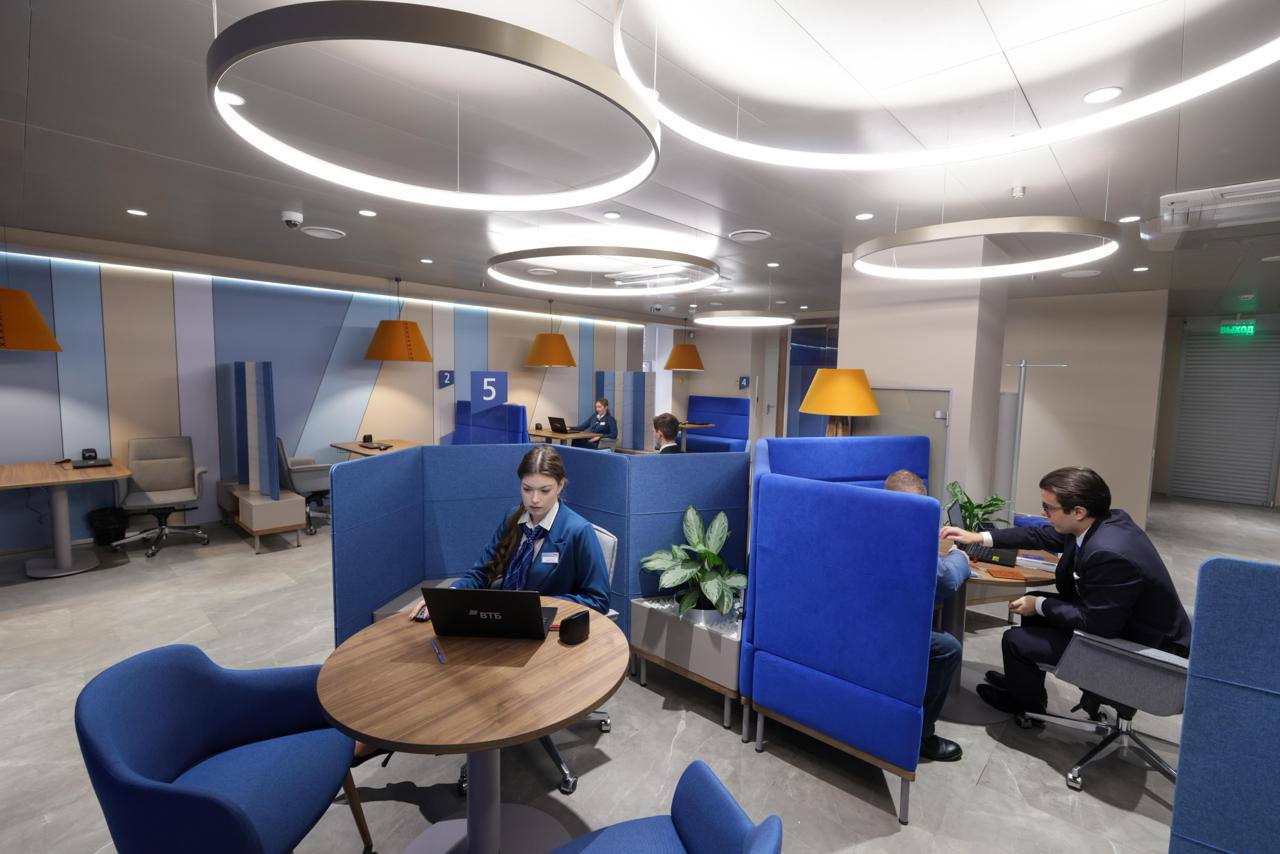 В новом флагманском офисе ВТБ оборудовали круглосуточную зону банкоматов, зону обслуживания физических лиц, интерактивный детский уголок, кассы и индивидуальные банковские сейфы, а на втором этаже разместили переговорные комнаты разных форматов, конференц-зал и комнату отдыха для сотрудников.