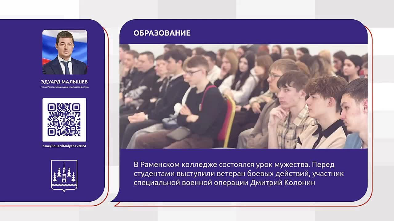 В Раменском колледже состоялся урок мужества. Перед студентами выступили ветеран боевых действий, участник специальной военной операции Дмитрий Колонин