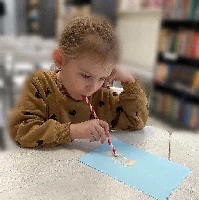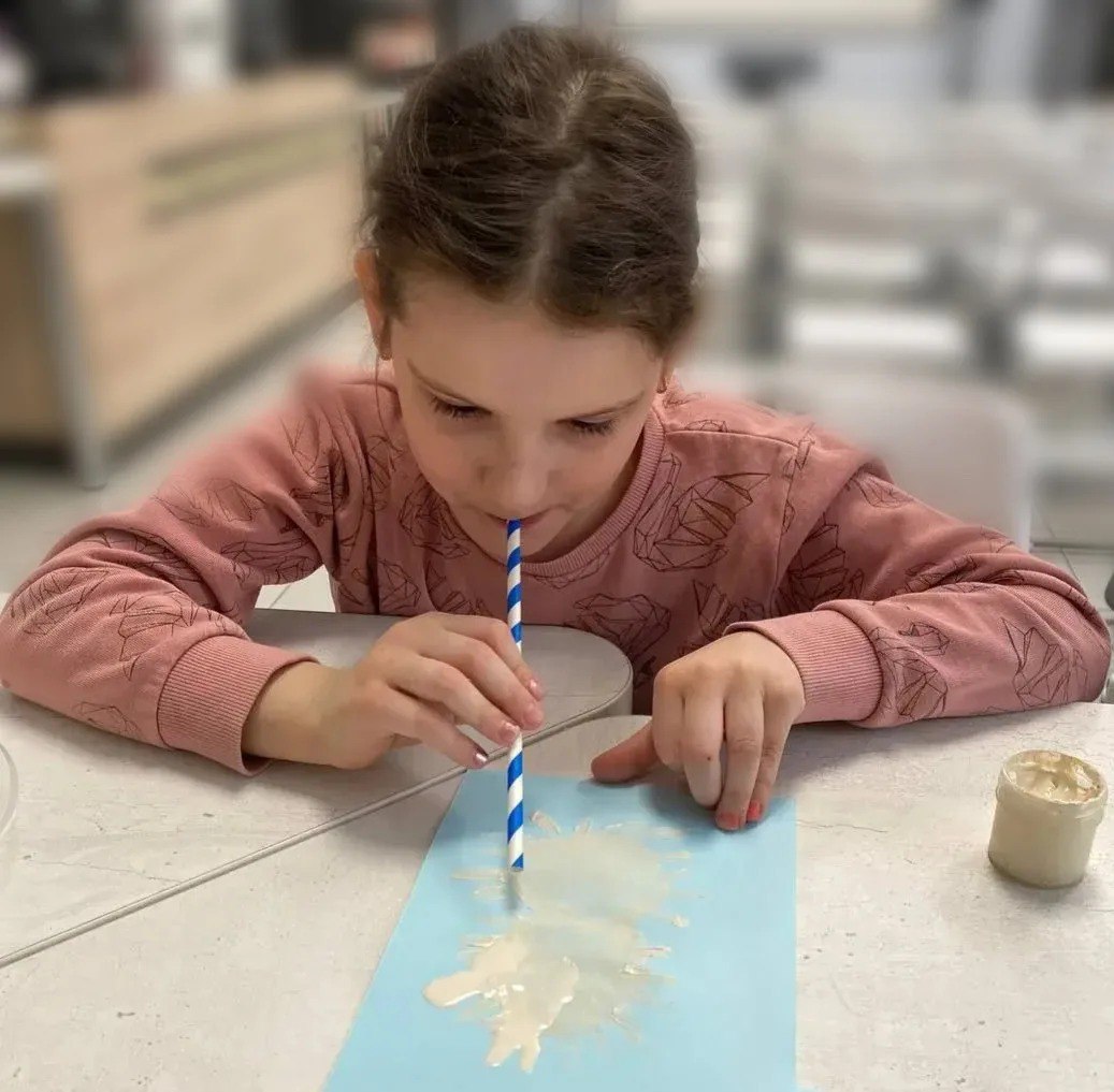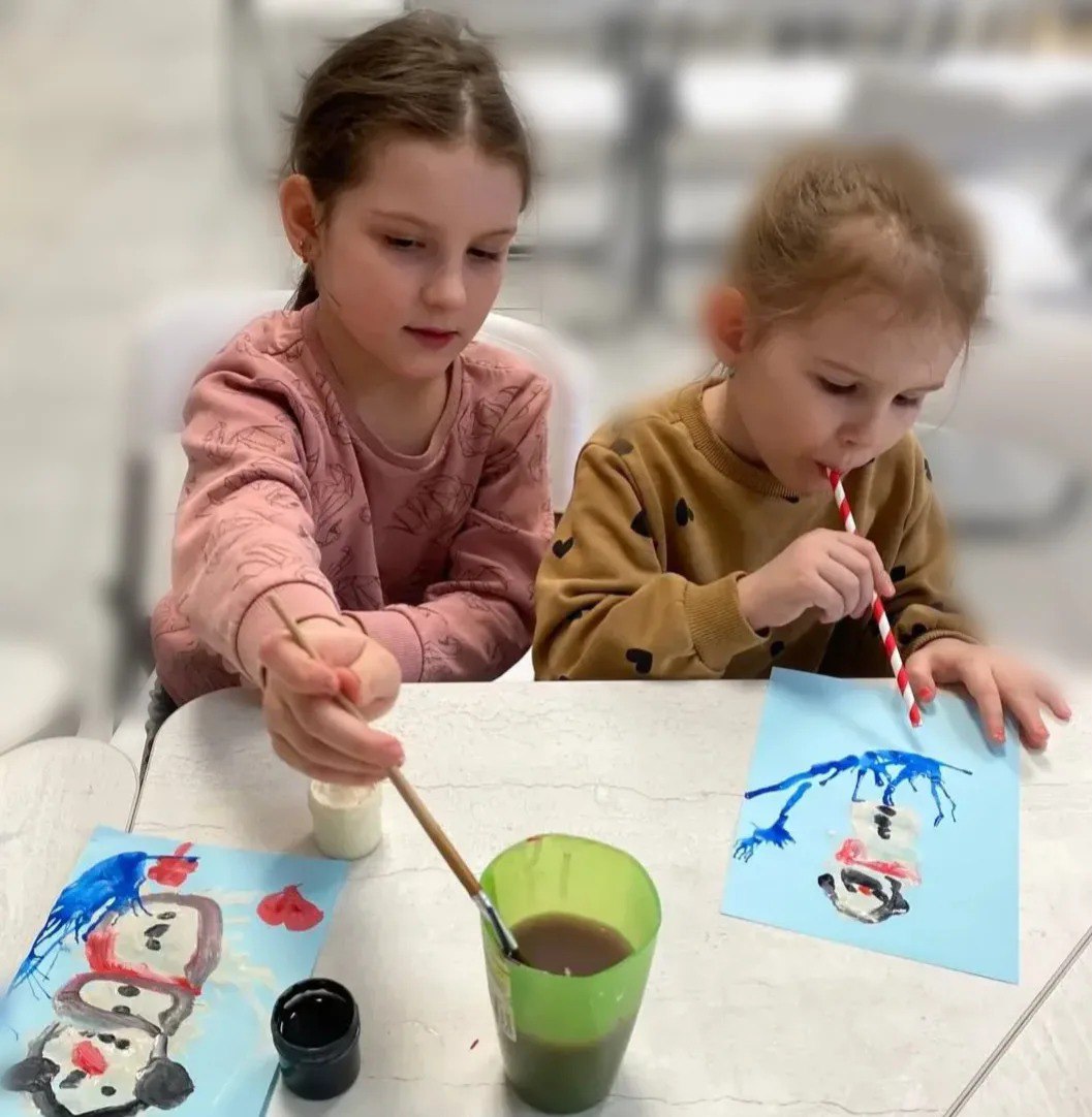 Ребята погрузились в волшебный мир искусства и создавали снеговиков из случайных клякс. Используя гуашь на голубых листах бумаги, юные художники экспериментировали с белой, чёрной, красной и синей красками.