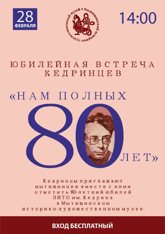 28 февраля в 14.00 кедринцы приглашают мытищинцев вместе с ними отметить 80-летний юбилей ЛИТО им. Кедрина в Мытищинском историко-художественном музее.