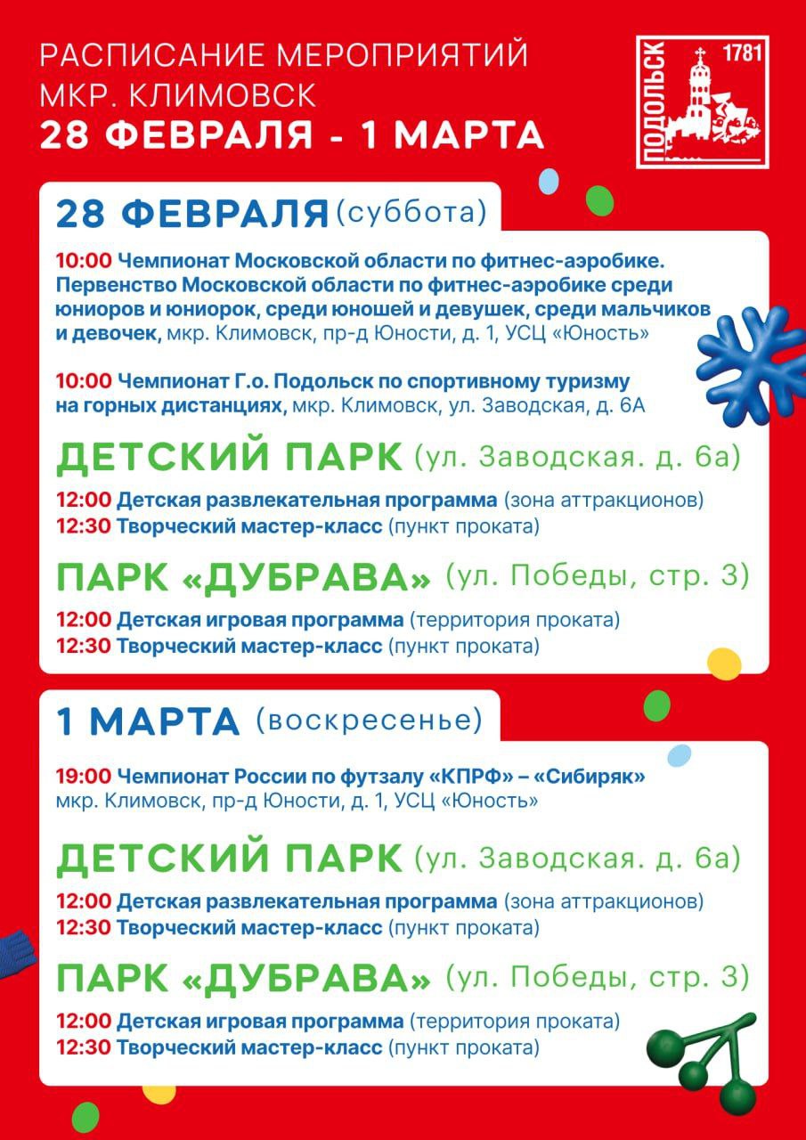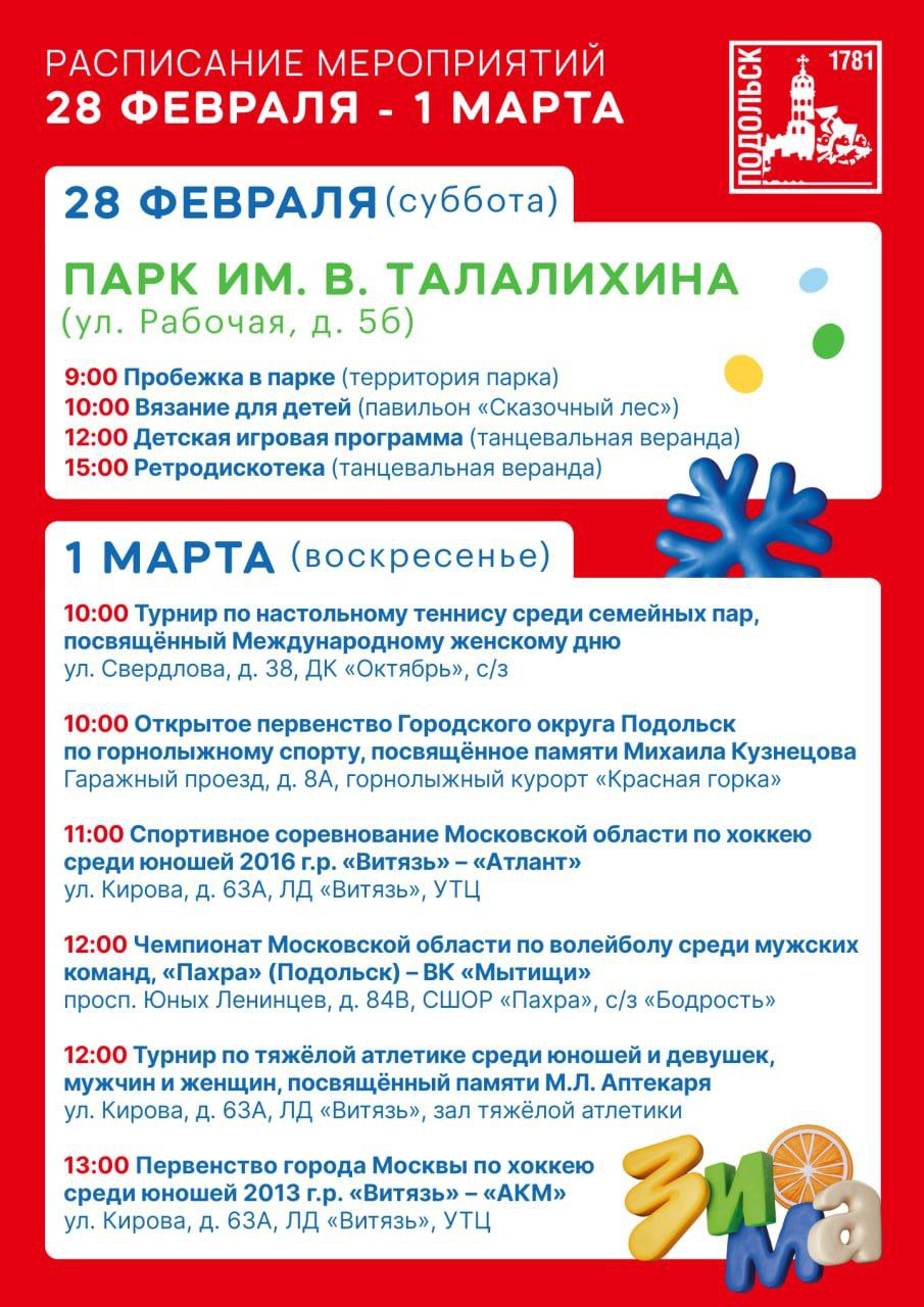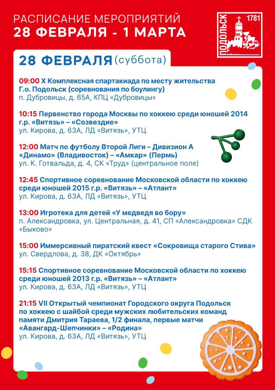 Для любителей спорта тоже много интересного: продолжается серия соревнований по хоккею, футболу, лыжным гонкам и волейболу. Болельщиков ждёт напряжённая борьба, яркие эмоции и новые победы. А 1 марта состоится турнир по тяжёлой атлетике, посвящённый памяти Михаила Лазаревича Аптекаря — событие, которое объединит сильнейших спортсменов Подольска и всех ценителей этого вида спорта.