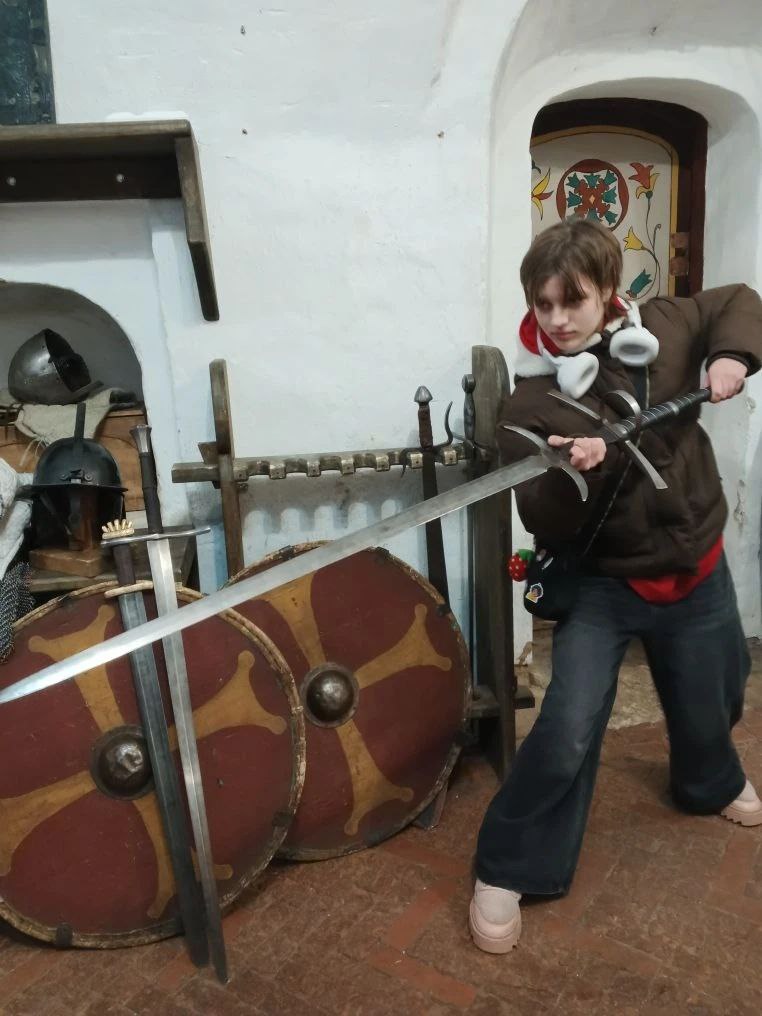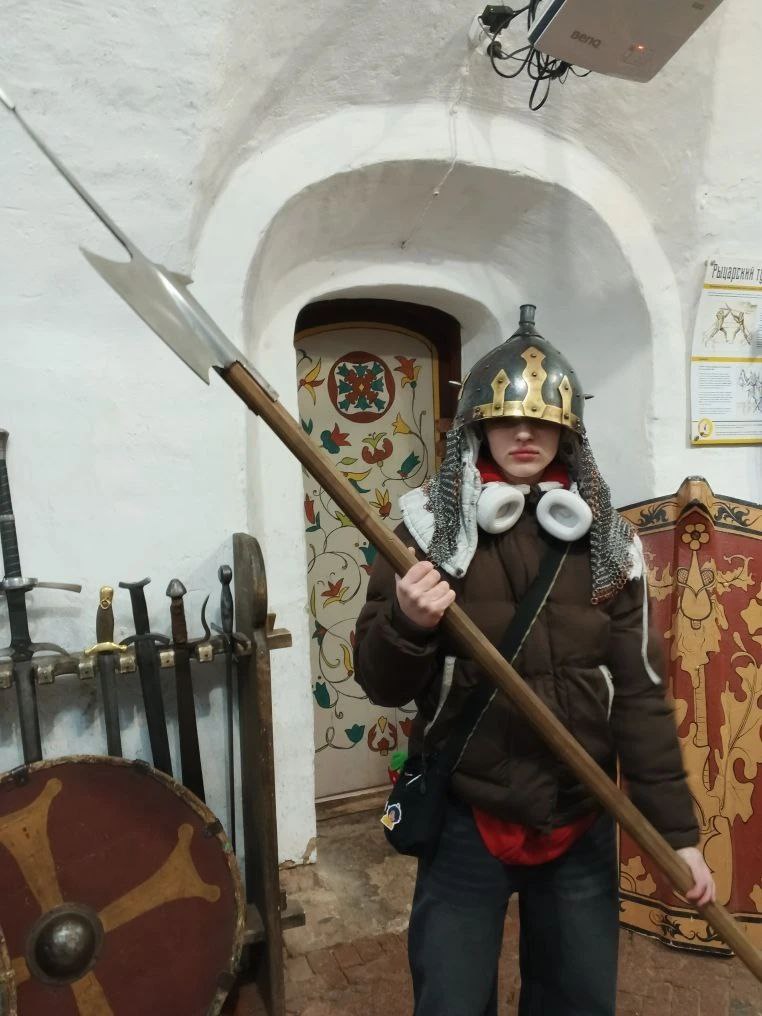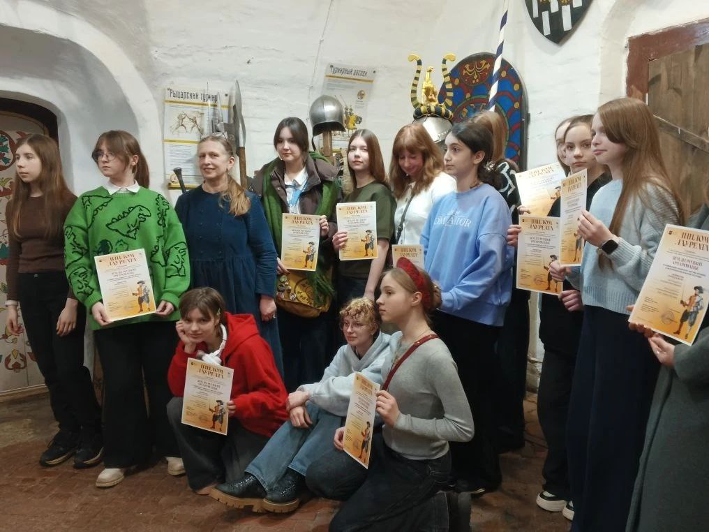 Победители конкурса после экскурсии смогли примерить средневековые шлемы, костюмы , подержать в руках настоящее рыцарское оружие.